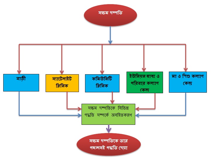 ১) ্ওয়ার্ড পর্যায়ে সংশ্লিষ্ট পরিবার কল্যাণ সহকারী বাড়ি বাড়ি গিয়ে অস্থায়ী পদ্ধতিসমূহ ( খাবার বড়ি, কনডম, গর্ভনিরোধক ইঞ্জেকশন) বিতরণ করবেন এবং দীর্ঘ মেয়াদী ্ও স্থায়ী পদ্ধতি গ্রহণের জন্য প্রয়োজনীয় পরামর্শ প্ড়ারদান করবেন। এছাড়া ইপিআই সেন্টার, কমিউনিটি ক্লিনিক থেক্ওে খাবার বড়ি, কনডম, গর্ভনিরোধক ইঞ্জেকশন গ্রহণ করা এবং এ সম্পর্কে পরামর্শ গ্রহণ করা যাবে।